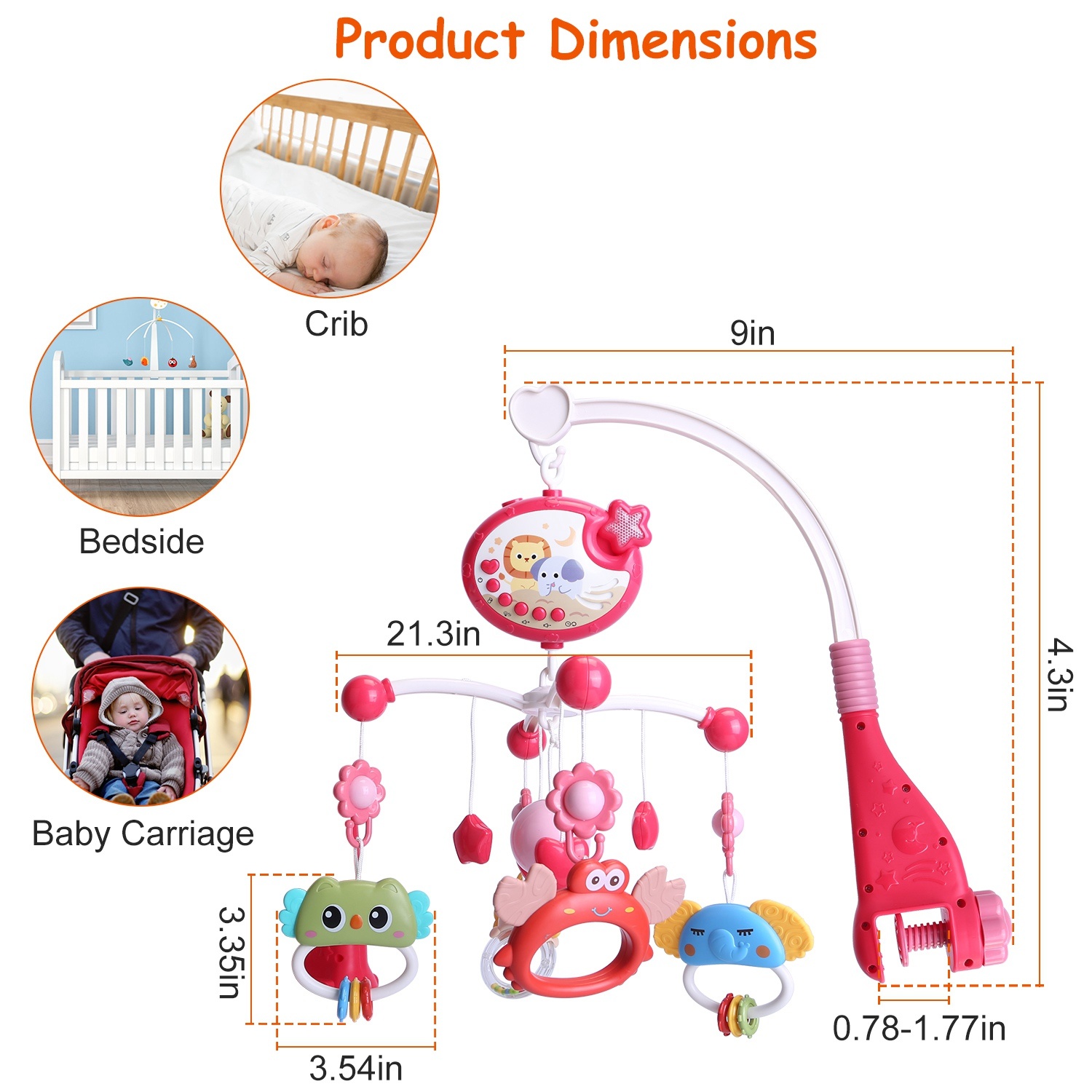 *Best Gift for Newborn*:Can be fixed on the baby crib bed or baby carriage. Only suitable for .78-1.77in(approx. 2-4.5cm).